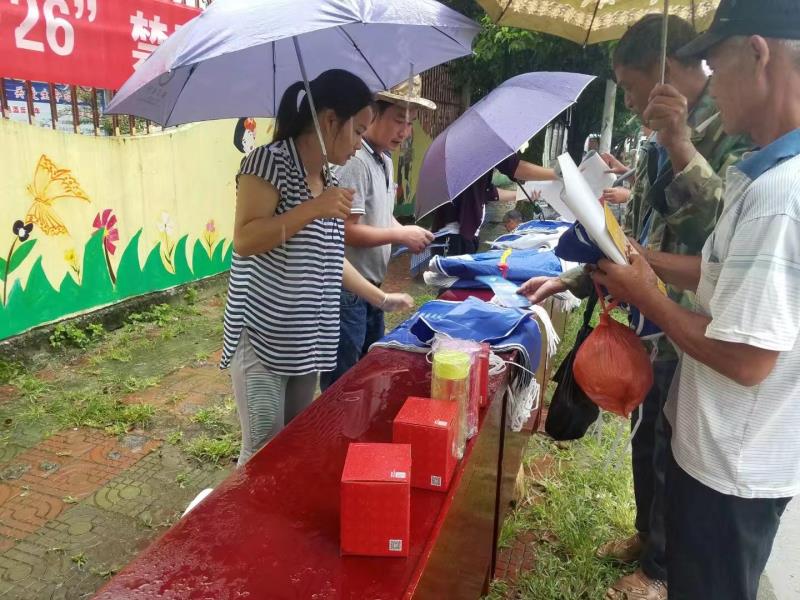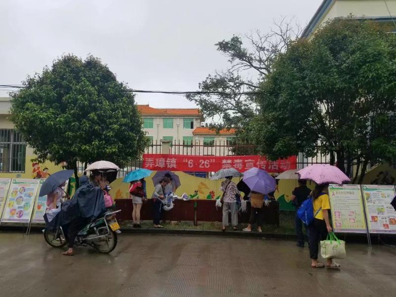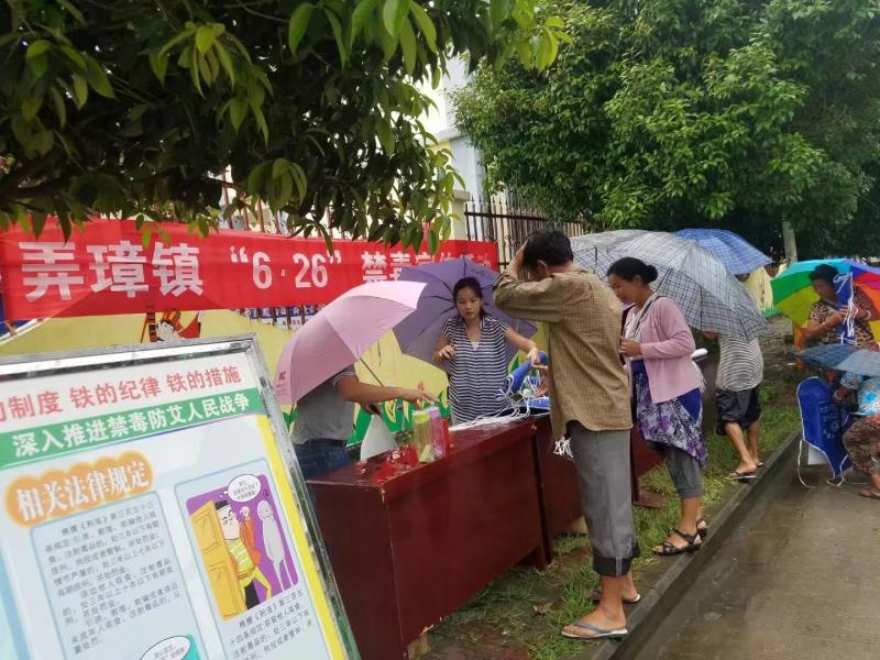 宣传日当天刚好是弄璋街天,很多群众都来赶集,看到工作人员开展禁毒宣传活动,纷纷驻足观看。宣传过程中因天气原因雨水不断,却依然抵挡不住群众前来咨询认毒、识毒、防毒和宣传禁毒的脚步。他们在现场饶有兴致地倾听工作人员的讲解,认真学习禁毒相关知识,还相互沟通交流,现场宣传学习氛围十分浓厚。