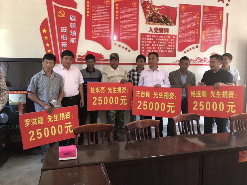 2017年下午在古里卡村会议室,由盈江县交通局牵头发动社会爱心人士捐资10万元帮扶古里卡村。会上,4位爱心人士轮流发言,表示了对脱贫攻坚工作的关心与支持,同时将继续加大帮扶贫困力度参与到脱贫攻坚中来。驻村工作队州安监局长黄顺益和古里卡支书蔡兴文同志对爱心人士表示感谢,汇报当前精准扶贫工作的开展情况和遇到的困难和问题,并承诺将帮扶资金用于危房改造和脱贫攻坚工作中。其次,镇长郗承磊同志对爱心人士表示感谢的同时,也将监督好、管理好帮扶资金,把资金用在刀刃上,发挥经济效益最大化,助推全村脱贫攻坚、人居环境等工作。最后,4位爱心人士向古里卡村捐资10万,古里卡村委会送上锦旗表达了全村人民对爱心捐赠的感谢。