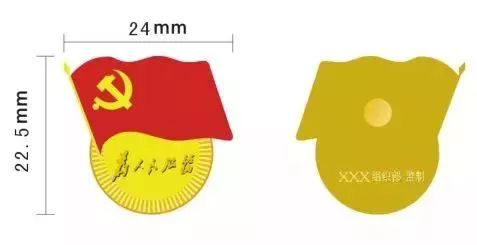 正面上方为中国共产党党旗图案,下方为圆形图案,印有“为人民服务”字样; 背面标注××省(区、市)或××部门(系统)党委组织部监制字样。徽章尺寸为24mm×22.5mm×2mm,材质为锌挂镀仿金。