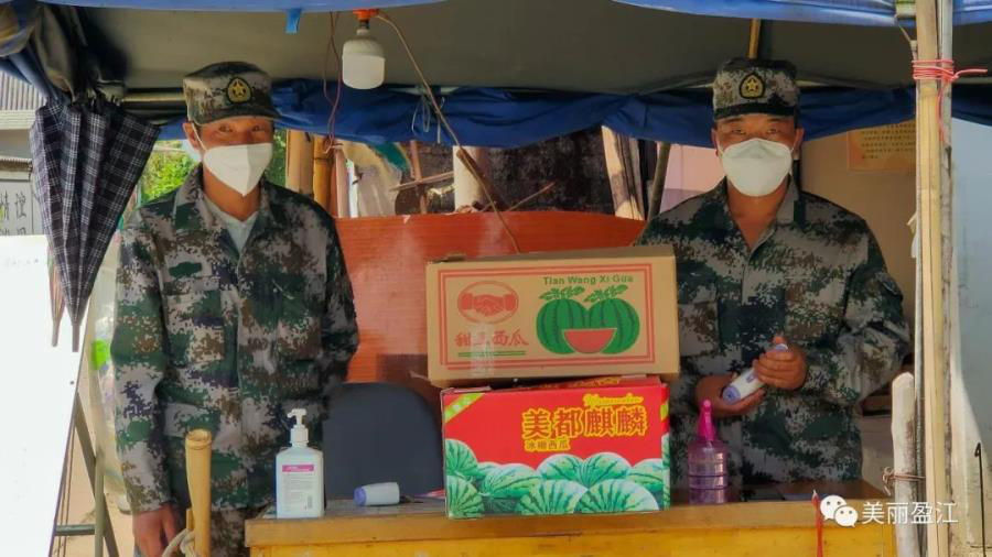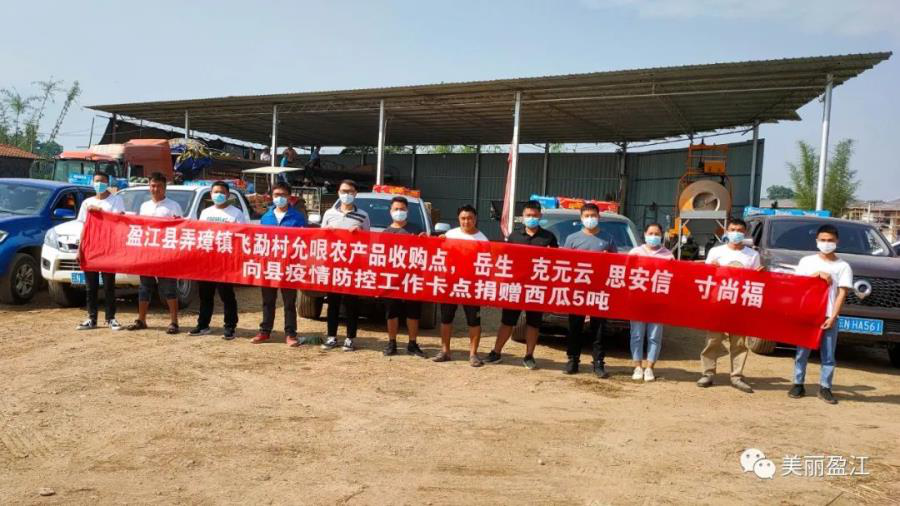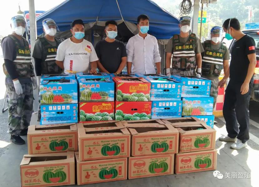 为助力盈江县疫情防控和边境管控工作,盈江县弄璋镇飞勐村4户瓜农伸出援手,通过县党政军警民合力强边固防指挥部向各抵边乡镇疫情防控卡点捐赠5吨西瓜,用实际行动诠释了群众的社会责任,为抵边一线执勤值守人员带来一份夏日凉爽。