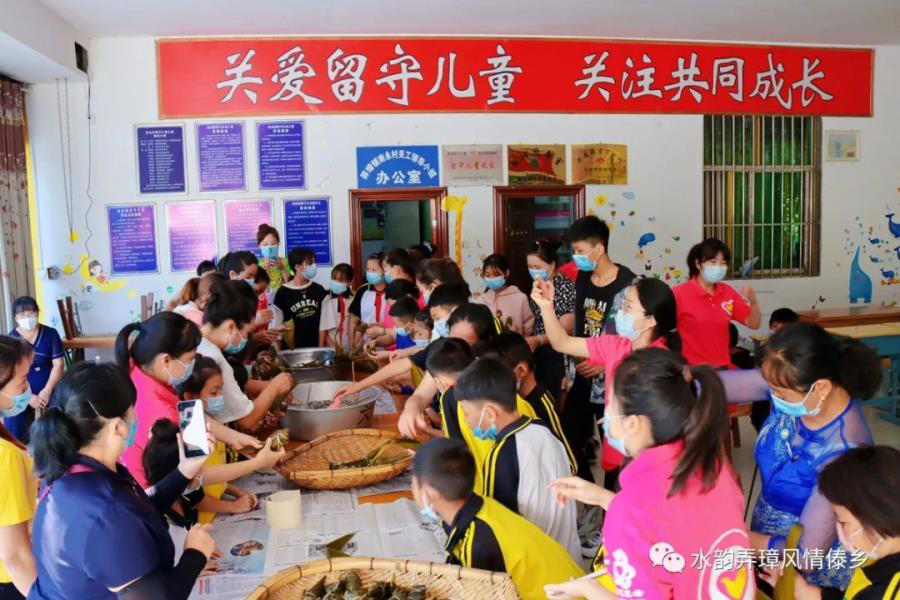 为了让孩子们感受到节日的温暖和喜悦,30位“爱心妈妈”端来提前准备好的粽叶、糯米、肉、饭豆等包粽子所需原材料,与孩子们欢聚在一起开展“庆端午节”包粽子活动,“爱心妈妈”们手把手耐心地从洗米、滤水、掐肉馅、卷粽叶、装糯米、拴绳子等包粽子的步骤和技巧教给孩子们,孩子们按照步骤去做,看起来既认真又乖巧…… 一个个或小巧玲珑或奇形怪状的粽子摆上大筲箕、放入大锅、烧火煮起。粽子煮熟出锅后,给每个孩子备了一袋粽子带回家,开心地和家人一道品尝。