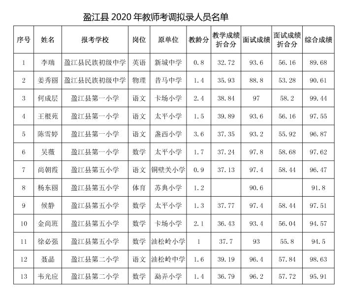 根据《盈江县2020年教师考调公告》要求,现将盈江县2020年教师考调拟录人员做如下公示,公示期为2020年8月3日—2020年8月7日。若有异议,请与盈江县教育体育局人事股联系,联系电话:0692-8113194。