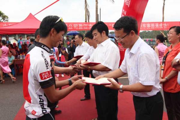 10月4日上午,2012年浪漫天灯节“环大盈江”自行车赛颁奖仪式在芒胆路口隆重举行,县人大常委会主任郑光永、县政协主席王振泽、县委副书记杨荣凡等领导出席颁奖仪式并为获奖选手颁奖。县委常委、县委宣传部部长管斌主持颁奖仪式。