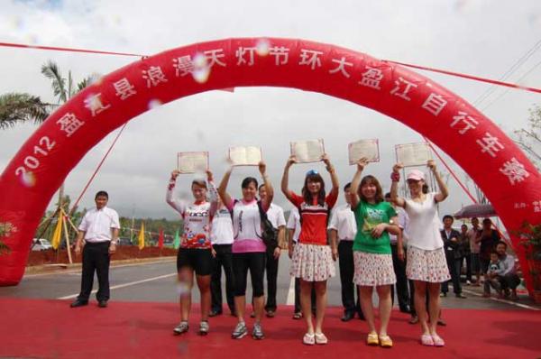 2012年浪漫天灯节“环大盈江”自行车赛在活动组委会的周密策划和精心筹备下,在裁判员、工作人员的公正裁决和热情服务下,经过来自盈江县内外196名自行车业余运动员的顽强拼搏和激烈角逐,最终决出男女组各前20名。李山以57分49秒3的成绩夺得男子组冠军,魏魁、普金学分获男子组二、三名; 陈丽娟以1小时14分9秒的成绩夺得女子组冠军,杨建红、郑丹分获女子组二、三名,本次赛事圆满成功。