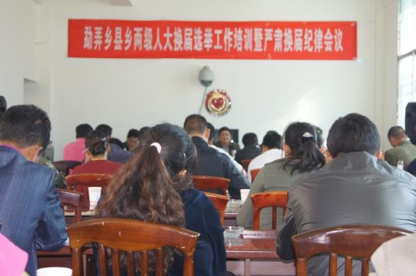 2012年10月29日,勐弄乡召开县乡两级人大换届选举工作培训暨严肃换届纪律会议。县委常委、县纪委书记杨朝友,乡镇换届选举联络员、县招商合作局局长刘辉到会指导。