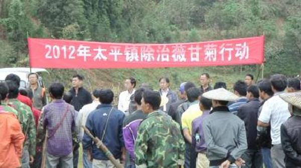 薇甘菊是一种外来有害生物,对农业、林业生产危害极大。太平镇有24公里边境线与缅甸接壤,受薇甘菊的危害严重。云南省林业厅挂县保乡联户太平镇以来,对太平镇林业产业发展给予大力支持和帮助。针对太平镇薇甘菊危害严重的实际,省林业厅党组高度重视,将太平镇列为林业有害生物防治省级示范区,核拨专款用于太平镇薇甘菊除治工作。