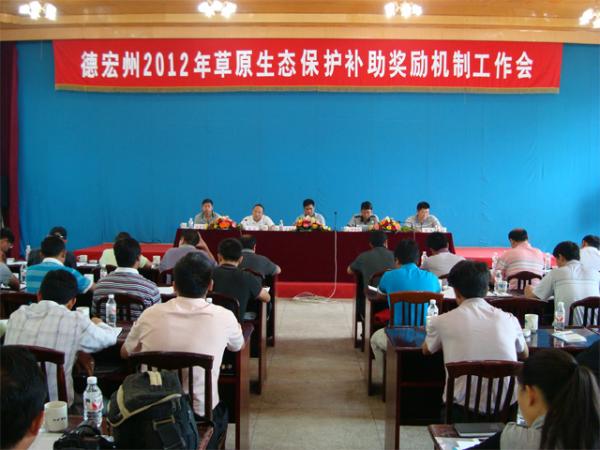 6月27日上午,德宏州2012年草原生态保护补助奖励机制工作会,在盈江县人民政府会议厅顺利召开。州县畜牧兽医局、农业局、财政局、林业局、发改局、审计局、国土局、档案局、农经站等领导和盈江涉及项目乡镇负责人共48人参加了会议。县委常委、县人民政府罗祥荣副县长出席会议并作表态发言。