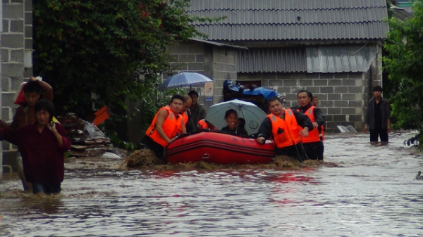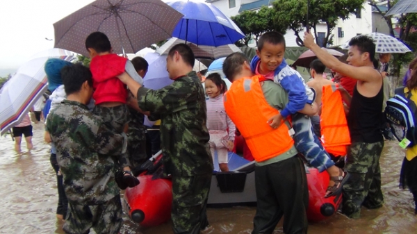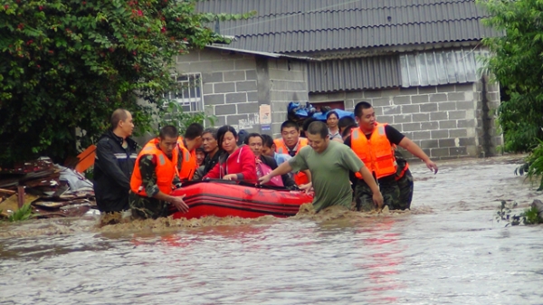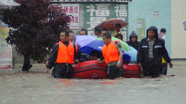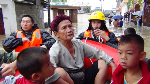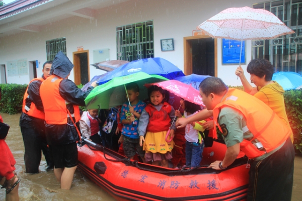 消防官兵用皮划艇疏散阳光幼儿园的学生