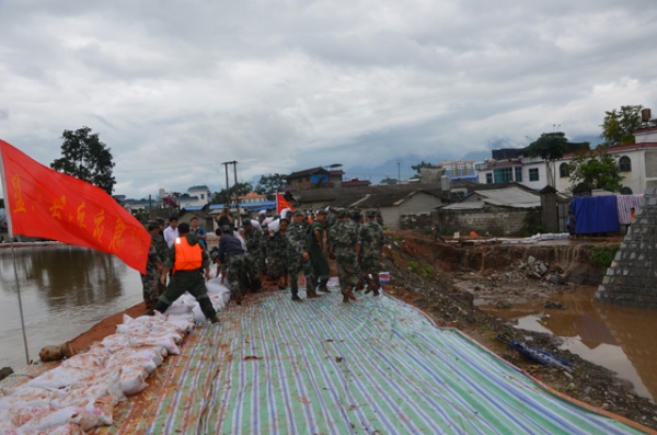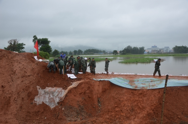 武警官兵抢修盏达河堤坝