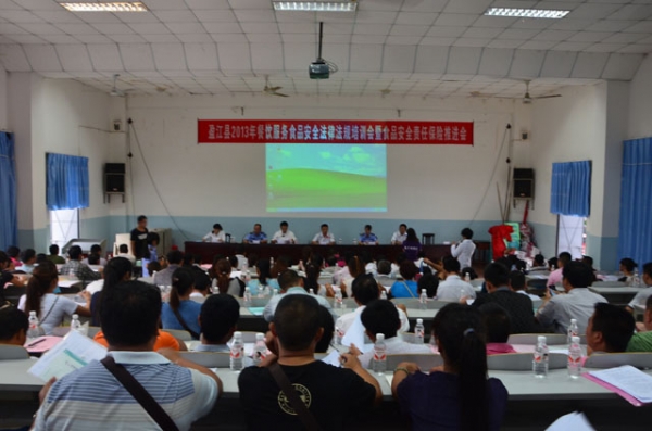 为增强我县餐饮业从业者的责任意识和诚信守法意识,提升餐饮业从业者专业知识水平和岗位服务能力,及时将中央、省、州关于餐饮安全管理的有关政策、规定和餐饮服务食品安全相关知识进行再宣传、再学习,2013年8月16日上午,我县召开了2013年餐饮服务食品安全法律法规培训会暨食品安全责任保险推进会。县人民政府副县长康建辉、县食品药品监督管理局局长徐学周、县人民政府办公室副主任思延、食品药品监督管理局相关人员、各中小学及托幼机构负责人、各大餐饮业业主共200余人参加了会议。