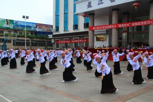 8月8日上午,大盈江广场聚集了600名老年朋友,来自盈江县15个乡镇和农场的16支队伍通过近一个多月的练习,在此集中展演“福满乾坤”养生操,向全县宣传健身养生理念,以此迎接第5个“全民健身日”的到来。