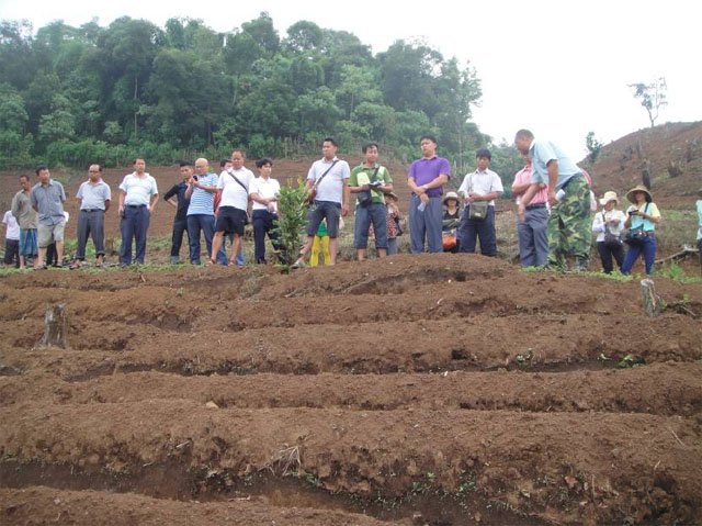 此次培训的主要内容: 一是旱地蔗等高线槽型栽培技术。参会人员现场观摩了人工开挖槽型蔗沟的过程并学习了相关技术要点,通过对比观看机械挖沟和传统方式种植甘蔗的长势,深刻领悟了推行旱地蔗等高线槽型栽培技术重要性和必要性;二是高海拔旱地甘蔗品种适应性观摩。盈江县甘蔗的常规种植海拔高度在1200米以下,通过近年来的探索、试验,县蔗糖办筛选出了一批适宜在更高海拔区域种植的甘蔗品种。培训地点户拉山海拔为1440米,种植有川糖79/15、粤糖86/368、盈育91/59和德蔗03/83共4 个品种,长势良好。在技术员的讲解下,参会人员现场观摩和学习了这4 个品种的长势、特征、特性、适应性及识别方法。