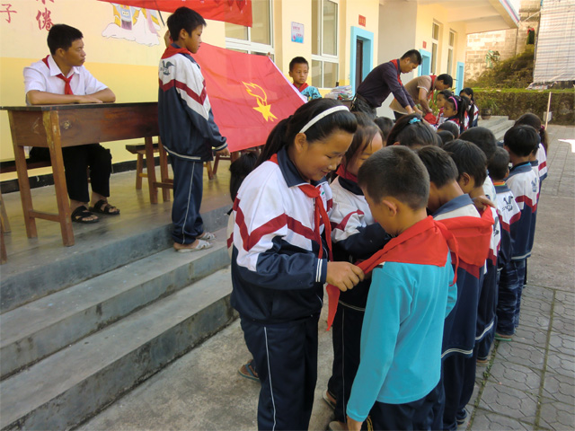 随后新一批少先队员入队和表彰优秀,树立典型。由老队员为新队员配带鲜艳的红领巾,代表了学校大队对新入队同学的肯定。通过开展创先争优活动,给少先队员营造了一个积极向上的学校氛围,给少先队员们树立学习的榜样。在鲜红的大队旗退下后,庆祝活动结束了。