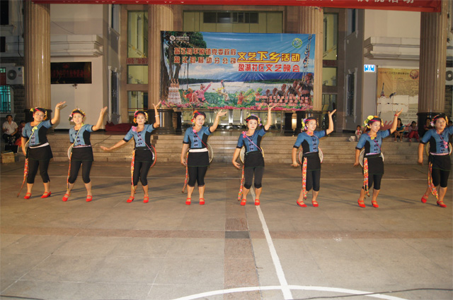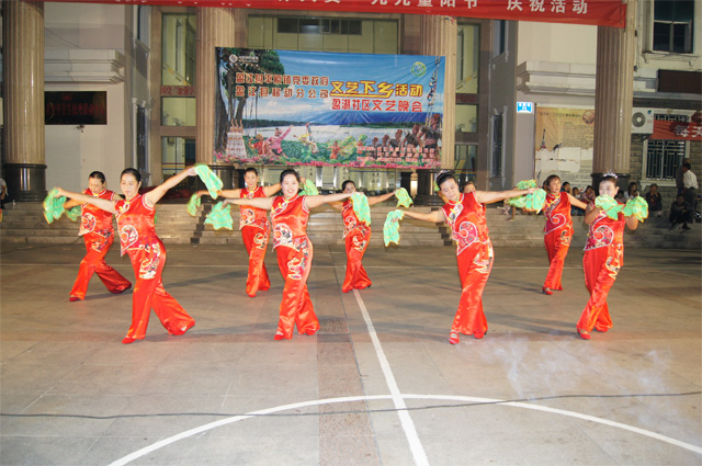 文艺活动以一首大合唱《歌唱祖国》拉开了帷幕,来自各小区文艺队为现场观众表演了舞蹈《红色娘子军》,情景剧《珍爱生命,远离毒品》,舞蹈《我们都是一家人》、《泼水欢歌》、《插秧的小朴少》,诗朗诵《公民道德三字经》,时装秀,庆丰收,学习雷锋好榜样等精彩的11个文艺节目。文艺表演精彩纷呈,现场观众认真观看,气氛热烈,他们对这次文化下乡演出活动充满了热情和喜爱,台上台下感情互动,掌声笑声此起彼伏,把整场活动一次又一次推向了高潮。