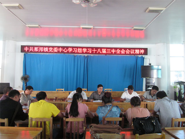 2013年11月20日,那邦镇党委中心组召开学习会议,集中学习了十八届三中全会精神。全镇党政领导班子、各党支部书记参加了学习会议。