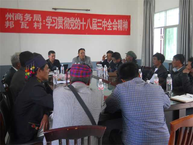 2013年12月19日下午,州商务局积极深入到挂钩点邦瓦村开展学习宣传贯彻党的十八届三中全会精神宣讲活动。州商务局党组书记李永海、副书记王庆军、驻村工作队员、新城乡人大主席孙金荣、邦瓦村“两委”班子成员、各支部书记及各村民小组长参加了宣讲活动启动会。