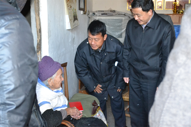 1月22日上午,副州长杨世庄带领第二慰问小组先后慰问了老党员、五保户、残疾户。每到一户群众家里热情的送上春节的祝福,问候困难群众身体状况,询问群众田里的农活,造成困难的原因以及子女上学和就业的情况,离开时将慰问金和慰问品送到困难群众的手中。