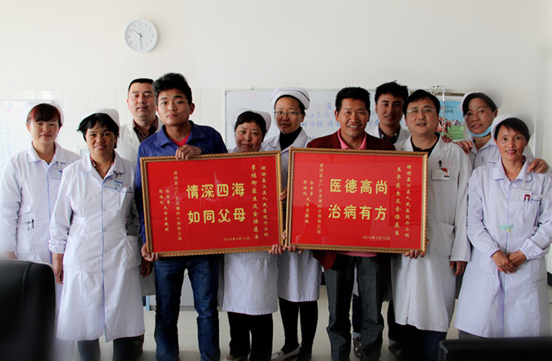 康复之后,29床的患者余某捧着两块题为“医德高尚,治病有方”“情深似海,如同父母”的牌匾送到副院长兼外科主任王平同志和主管医师任国强的手中,怀着感激之情连声道谢:“谢谢你们了,如果没有你们,就没有我们一家人的幸福!”