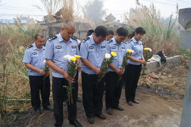 民警们到达赵廷德墓前,除去墓上的杂草和厚厚的尘土。清理完毕后,参加祭扫的民警站成一排,在石副局长带领下,重温了赵廷德同志的生平事迹和感人的工作作风,民警们满怀着敬意,向赵廷德默哀,献上鲜花寄予一份深深的哀思。