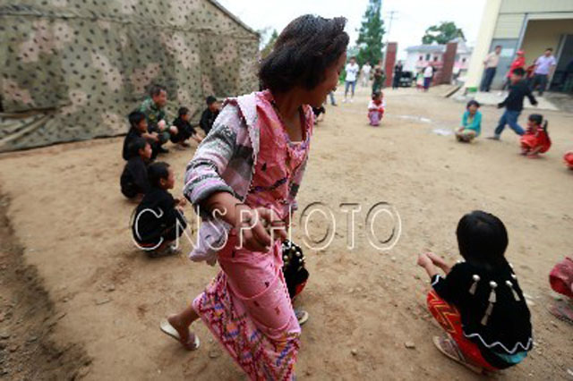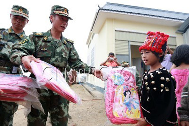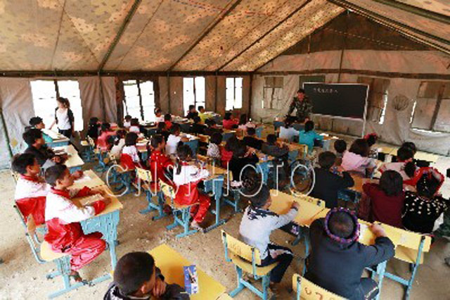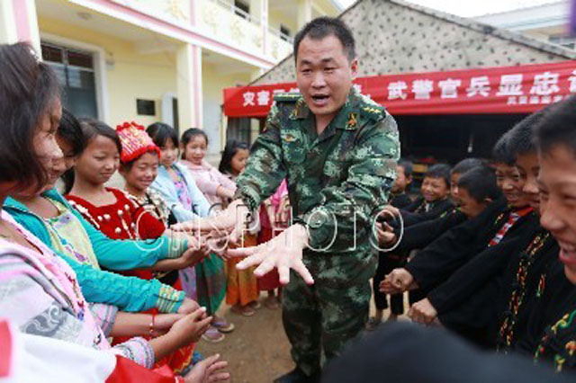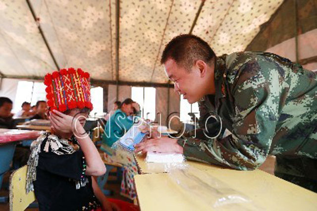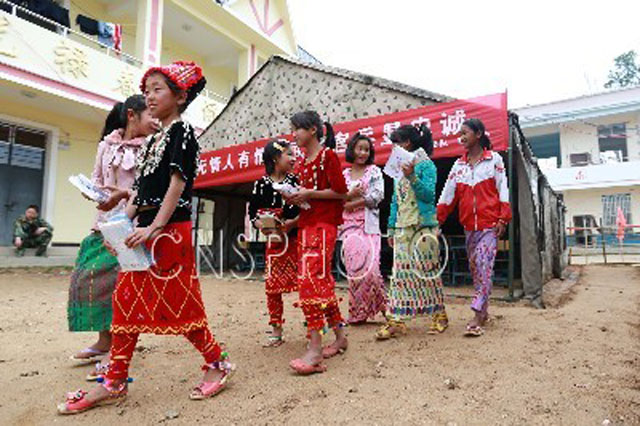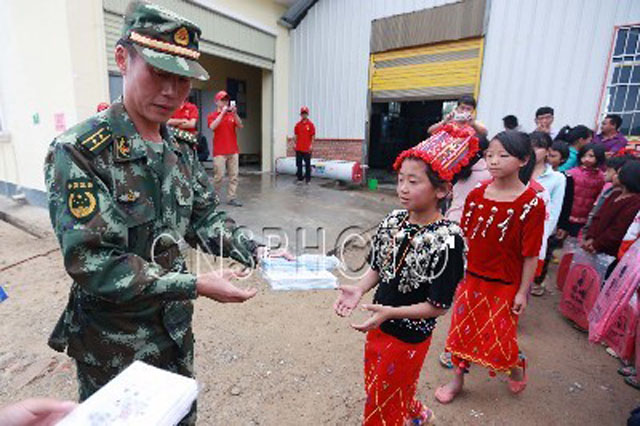 5月27日,德宏傣族景颇族自治州盈江县卡场镇吾排小学迎来了复课的日子。云南总队德宏支队官兵来到学校,为学生们捐赠了价值6000元的办公用品和文具,开课前,官兵和全校师生一同高唱国歌,升起复课后的第一面国旗。同时,在支队官兵搭建的“帐篷小学”里,官兵为师生进行了“防震避灾”知识讲座和心理疏导游戏,为灾区孩子们赠送特殊的节日礼物,陪灾区孩子度过了一个难忘的“六一”儿童节。