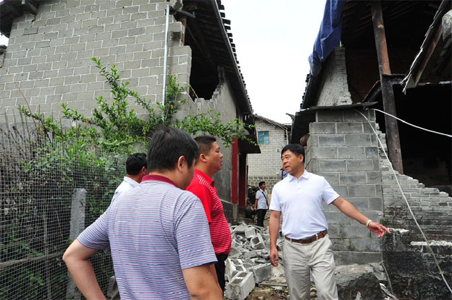 四岔路村位于卡场镇与勐弄乡交界处,在地震中受损严重。地震发生后,村中房屋几乎全部出现墙体开裂甚至倒塌情况,当孔亮一行来到四岔路村时,眼前的满目疮痍让大家变得沉默,踏着散落在地上的瓦片,孔亮仔细查看了各家各户房屋受损情况,向村干部了解群众临时安置情况,当了解到此次地震虽然造成巨大破坏,但全村未出现人员伤亡时,孔亮深感欣慰,随后,孔亮来到救灾帐篷与村民交谈,他鼓励群众坚定信心,在政府的指导下积极开展自救,尽快恢复生产,着手重建家园。他说:地震灾害带来的破坏,给群众的生产生活造成了困难。但困难是暂时的,有各级党委和政府的关心、帮助与支持,只要受灾群众艰苦努力,自力更生,我们就一定能够战胜灾害,渡过难关,重建家园。