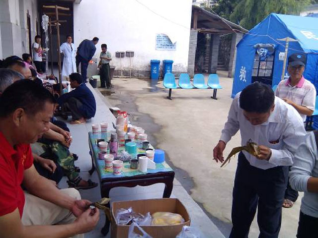 驻苏典乡卫生应急工作队队员郭祥瑞医生如是说,“看到粽子,才想起今年的端午节马上要到了,感谢局领导的关心了。……”抓起粽子吃了两口,他说,“是傣味的”,边吃边走,又投入到新的战斗之中……。据了解,郭祥瑞医生是5月25日进驻苏典乡的,作为一名党员,一名长期在基层从事卫生防疫工作的老同志,灾区安置点消毒喷洒工作那样重、那样危险,他都抢着做。就这样,已经坚守岗位一周多。