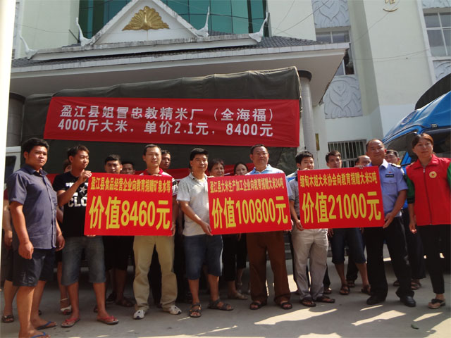 自“5·24”地震发生后,盈江县食品药品监督管理局便向全县食品企业协会倡议踊跃向灾区人民献爱心,在县食药监局的倡议下,6月1日上午,盈江县粮食加工协会、缅甸木姐大米协会和盈江县食品经营企业共同向灾区学校捐赠了价值人民币13万余元的救灾物资。在这批救灾物资中,有盈江县粮食加工协会中14家大米加工厂捐赠的24吨大米,缅甸木姐大米协会捐赠的5吨大米和盈江县食品经营企业捐赠的400件(桶)矿泉水。