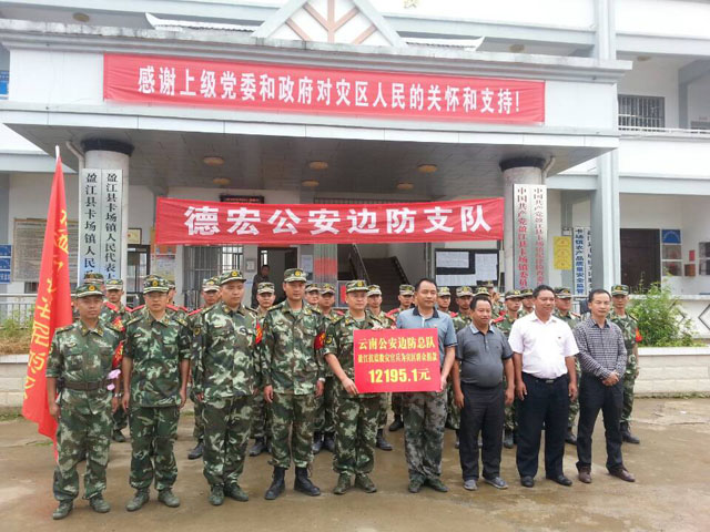 在抗震救灾中,云南公安边防总队没有忘记灾区人民群众,6月8日上午,总队参与抗震救灾官兵纷纷慷慨解囊,自发组织开展捐款活动,踊跃向地震灾区捐款12195.1元。云南公安边防总队德宏公安边防支队副政委刘云飞说,我们灾区人民生活非常困难,地震发生后,雪上加霜,官兵们看在眼里,记在心里,为了弘扬“一方有难,八方支援”的优良传统美德,官兵们慷慨解囊,积极为灾区人民捐款,献出自己的爱心,希望我们灾区人民群众尽快能够恢复生产生活秩序,重建自己的家园,早一点过上好日子。同时,我们将奋战到底,夺取最后抗震救灾的胜利。