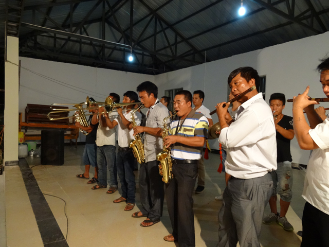 该乐队成员均来自玉麦寨,由12个景颇汉子组成,最小的17岁,最大的47岁。不久前村民小组自筹5万元,由社长雷明金亲自带队组织成员到芒市参加培训,在1个多月的时间里学习了笛子、萨克斯、长号、小军鼓、巴立洞、大鼓、小号等多种乐器。培训期间得到了州文体局书记高度评价。