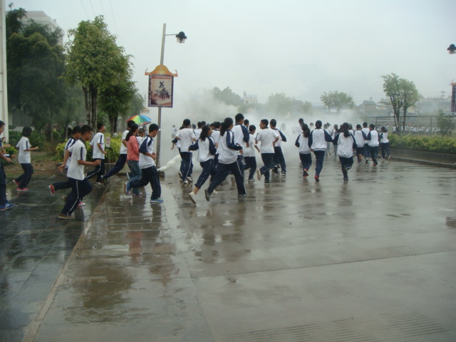 9月18日上午10时整,在盈江县人防指挥中心,盈江县防空警报试鸣指挥部下达统一试鸣命令后,我县各个警报点同步发放防空警报信号,全县17个警报器同时鸣响。为纪念“九一八”事变83周年,盈江县人防办联合县教育局、县卫生局在盈江县民族中学组织全体师生开展了一场以防空袭警报疏散为主题的应急疏散演练活动。此次演练,县民族中学全体师生都十分重视,政教处对演练程序做了周密安排,确保学生演练时人身安全。演练过程紧张、有序,刺耳的预先警报声响起,全体学生双手抱头,迅速离开教室到楼梯口冲向避难大操场,1500多名学生,仅用时2分39秒,就安全地撤离到了操场上。应急疏散演练活动达到预定目标,取得了良好的效果。