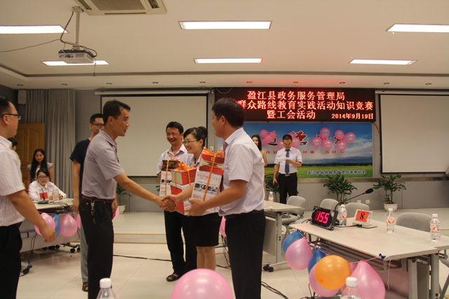 “请问,中国共产党的根本宗旨是什么?”“ 党的群众路线教育实践活动的主要内容是什么?”,9月19日晚,县政府服务局二楼的开标室灯火辉煌、掌声雷动,一场以“为人民服务,永远跟党走”为主题的党的群众路线教育实践活动知识竞赛正在如火如荼地进行着。来自局机关和进驻单位窗口的8个代表队24名队员参加了比赛。竞赛活动内容涉及党的知识、党的群众路线教育实践活动、十八大报告等方面的内容,融知识性、教育性、趣味性、竞争性于一体,竞赛分必答题、判断题、抢答题三种形式进行。8支参赛队伍在紧张激烈比拼中既表现了团队合作精神,又展现了个人风采,现场气氛热烈活跃、掌声迭起,经过两个小时的激烈竞争, 县政务局机关代表队荣获一等奖,工商和住建代表队荣获二等奖,其他代表队分别获三等奖和鼓励奖,赛后出席活动的县政务局领导分别为获奖的参赛队颁发了奖品。