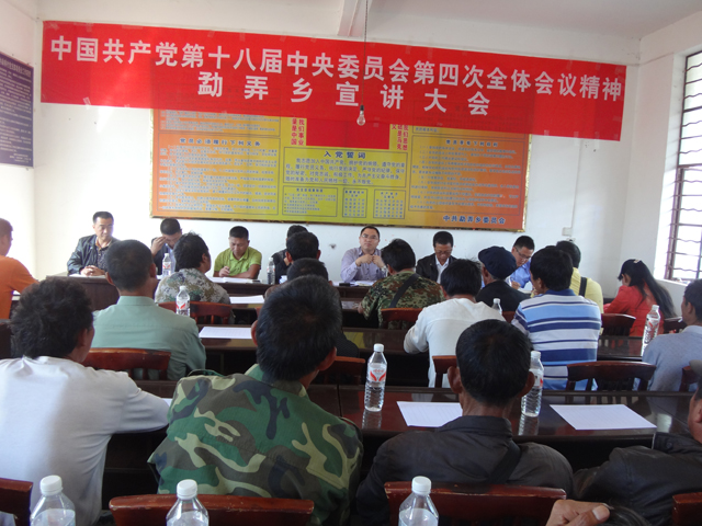 中国共产党第十八届中央委员会第四次全体会议,于2014年10月20日至23日在北京胜利举行。为认真学习传达十八届四中全会精神,根据10月30日晚全县领导干部大会上县委陶书记的讲话要求,勐弄乡党委高度重视,立即行动,将传达学习十八届四中全会精神当做一件重要的政治活动抓紧抓实,于11月3日在勐典村党总支部组织开展了全乡十八届四中全会精神宣讲大会。