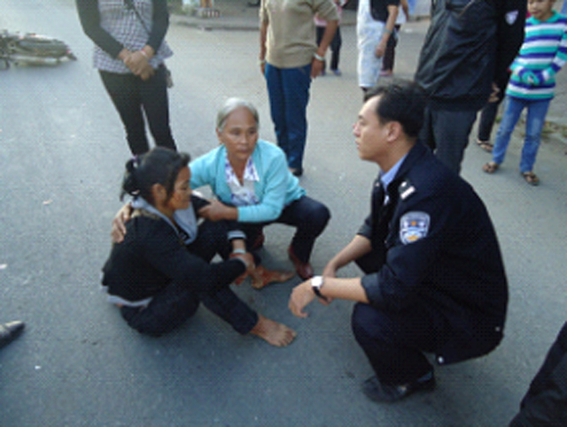 2014年11月18日18时,盈江县森林公安局弄璋派出所民警在食堂吃饭时,突然听到单位门口公路上传来车辆碰撞声,派出所民警闻声而起前去查看,发现一辆微型面包车与一辆摩托车相撞,有一中年妇女躺倒在地上。摩托车驾驶员浑身血迹,旁边的几位群众神色紧张、束手无策,民警立即对受伤群众进行包扎。由于事发地点正值腾瑞大道,来往车辆较多,如不及时处置,后果不堪设想。派出所民警及时在事故现场设置危险警示标志,疏导交通、疏散围观群众,保护案发现场,及时拨打“110”、“120”电话向交警、医院通报情况。同时,协助“120”急救中心救护人员对受伤的中年妇女进行救助,交警大队事故处理的人员到达事故现场处置之后派出所民警才离开。