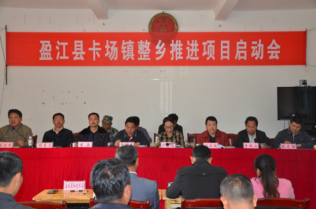 2014年 11月26日,盈江县在卡场镇召开扶贫开发整乡推进项目启动会。州政府副州长刀晓瑞、州政府副秘书长张家祺、州扶贫办主任李兵,盈江县委书记陶继清、县人大常委会主任李林山、县政协主席杨荣凡、县政府常务副县长张芝能、县政法委书记尹庆丰、县政协副主席武建军以及县委办、政府办、组织部、扶贫办、财政局、发展和改革局、交通运输局等县直有关单位领导及县联系卡场镇挂钩领导、卡场镇班子成员、各站所负责人、所在村“两委”班子成员、村民小组长60余人参加了会议。
