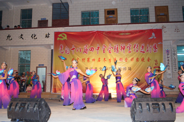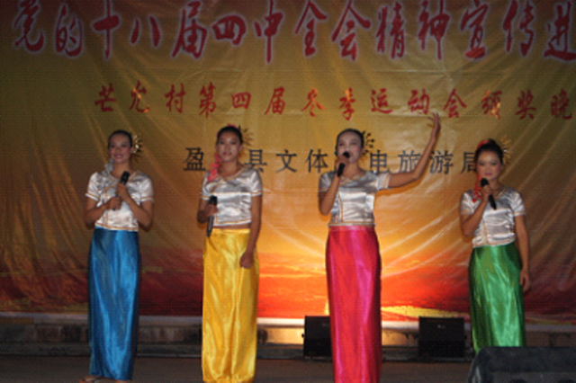 晚会以民族文化工作队带来表现田园色彩的舞蹈《风情田园》拉开帷幕;由芒允村带来的舞蹈《傣家毕朗甩鼓狂》把晚会推向高潮,该舞蹈曾荣获德宏州第一届“彩云奖”二等奖,赢得了全场的掌声;民族文化工作队带来的舞蹈《彩蝶舞梦》让村民意犹未尽,沉浸于欢歌笑语中。晚会演出高潮迭起,节目期间巧妙穿插了运动会颁奖和党的十八届四中全会精神宣传。演出现场十分热闹、精彩,观众掌声不断,每当歌手演唱时群众也跟着唱了起来,整齐、嘹亮的歌声里字字句句都道出了大家的欢喜,也让大家对社会主义法治国家的建成充满了信心和力量。