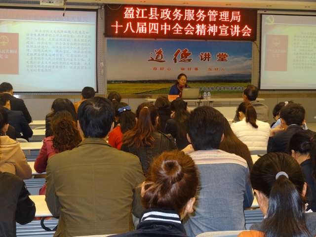 为深入学习贯彻党的十八届四中全会精神,把思想和行动统一到各级党委政府的重大决策部署上来,12月11日,县政务服务管理局举办十八届四中专题宣讲会,学习十八届四中全会精神。会议邀请到县委党校讲师杨晓聪做了主题报告,政务局机关及政务服务中心全体窗口工作人员70余人参加了宣讲会。