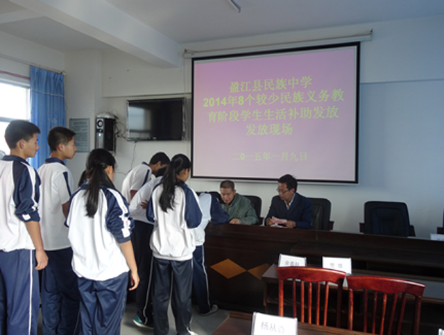 2015年1月9日下午,盈江县民族中学 在阶梯教室发放了2014年云南省8个人口较少民族学生补助资金。
