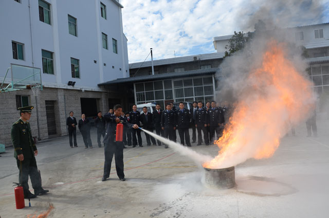 讲座上,李副队长从专业的角度对火灾的特点,火场自救逃生方法,如何预防火灾以及消防器材的管理等知识进行了深入浅出的讲解。随后,李副队长带领参训干警对法院办公大楼的消防器材及消防安全标识进行了检查,详细介绍了在面对不同类型火灾时,如何有针对性的使用灭火器。并在办公大楼后面的篮球场设置了燃烧物,向干警们现场示范了干粉灭火器的正确使用方法,李副队长演练结束后,现场干警每人亲自使用干粉灭火器扑灭燃烧物,通过亲身体验掌握灭火技能。