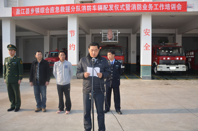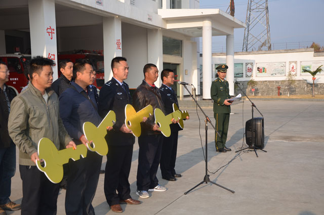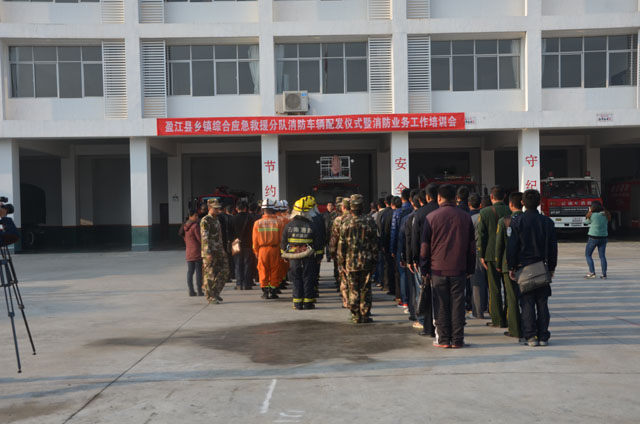 1月30日上午9:30时,盈江县乡镇综合应急救援分队消防车辆配发仪式暨消防业务工作培训会在县公安消防大队召开。