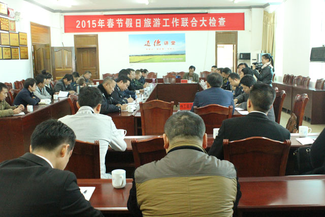 在春节来临之际,为确保2015春节期间全县旅游市场安全形势持续稳定,进一步加强旅游市场监管,规范旅游市场经营秩序,促进旅游市场健康发展,努力营造平安、有序、和谐的社会环境,确保全县人民度过一个安全、欢乐的新春佳节。2015年2月11日,由州、县政府组成的“春节黄金周旅游安全联合检查组”深入我县范围内星级饭店、旅游团队接待餐饮、旅游购物场所和客运站进行了节前安全检查。