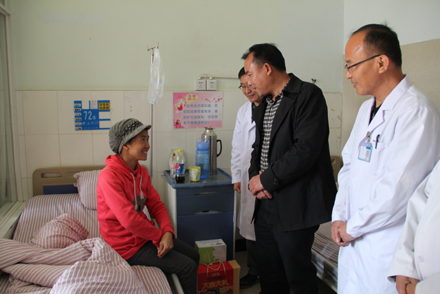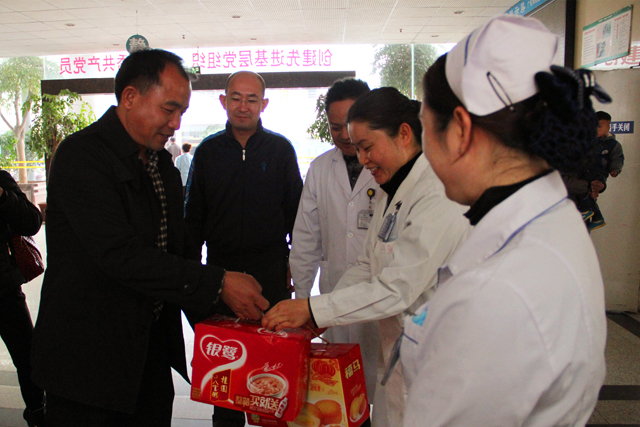 三阳开泰迎新春,2月17日,大年二十九,盈江县人民政府副县长杨华、县卫生局局长王琦、县人民医院院长瞿炳生、副院长宋建军、郭照耀、李恩元等领导组成春节慰问小组,先后到县医院妇产科、儿科等科室,向医护人员和住院患者送去了新春的慰问和祝福。