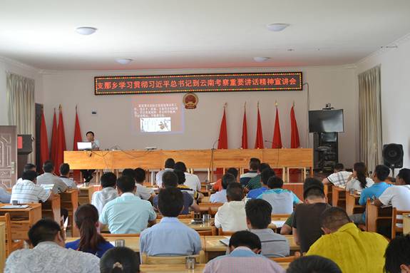 为进一步提高全乡干部职工思想认识,加快支那乡社会经济发展进程,深如落实“三严三实”和“忠诚干净担当”精神,5月11日下午,支那乡召开习近平总书记到云南考察重要讲话精神宣讲会,会议由支那乡党委副书记杨兴衡同志主持,县委党校老师段生武老师主讲,全体干部职工、乡直各站所、各村、中小学、卫生院等78人参加了此次会议。