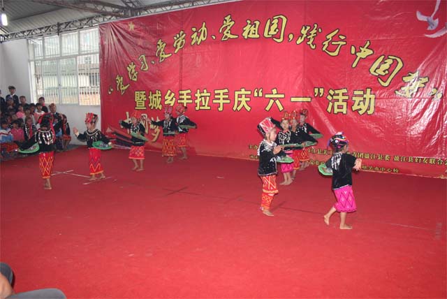 会上,举行手拉手结对仪式,来自盈江县第一小学和铜壁关乡中心小学的30对同学交换了亲手制作的节日礼物,表达了对朋友节日的祝愿。接着庆“六·一”文艺演出活动在景颇迎宾歌舞《欢迎您到来》中拉开的了序幕,县一小,老协、老体协,铜壁关小学、铜壁关双语幼儿园的演员们为在场的观众献上一个又一个精彩节目。节目内容丰富多彩,演员表演到位,将中华传统文化和景颇民族风情完美的展现在观众眼前。最后,景颇族传统舞蹈《目瑙》将整个演出带向高潮,参加活动的全体人员伴随着欢快的歌声,迈着热情奔放的步伐,共同度过快乐的一天。