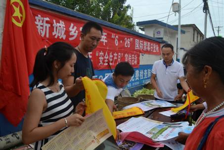 6月25日,新城乡人民政府利用街天,组织乡禁防办、食品药品协管办、安监站、计生办、乡团委等部门联合开展“6·26”禁毒防艾、安全生产、计生等宣传活动。