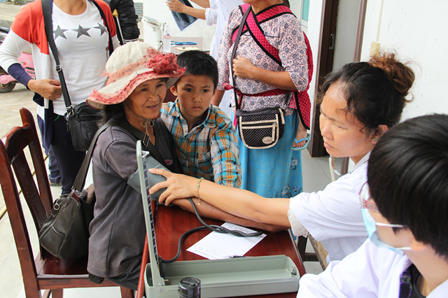 8月7日下午6点半,受暴雨影响,盏西镇关上村芒冷村民小组、松坡村勐弄村民小组、帮朗村三个村寨突发洪涝泥石流灾害,导致进村公路桥涵泥沙淤积,村寨沟渠堵塞,部分民房被淹,沿河部分道路受阻。8月10日,盈江县人民医院抽调内科、儿科、急诊科、检验科、影像科等科室的13名专家组成医疗队,前往盏西镇中心卫生院对灾区居民进行义诊。“医疗队来得太及时了!家里的草果地遭灾后,我就成天头晕,真怕自己关键时候病倒了。”张大妈是白石头村村民,她们村也受到泥石流影响,虽然人没事,但山地的损失还是让本就贫困的家庭雪上加霜。听说县医院医疗队来到盏西,一大早她就带着小孙子特意赶了过来。经县医院急诊科主任李艳玲诊断,张大妈血压偏低,考虑是由低血压引起的头晕,让她继续观察血压变化,以便能够对症下药。张大妈的孙子小山今年9岁,却只有21公斤,要比同龄人瘦弱许多,见状,县医院儿科专家克有丽对小山进行诊查。询问了孩子的饮食情况和是否有家族病史后,克医生给出了相应的诊疗意见。