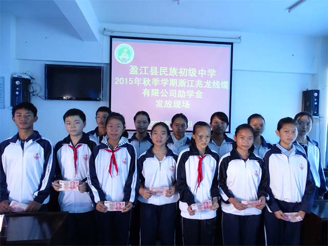 2015年11月5日,虽初冬已来临,但盈江县民族初级中学的同学们心里是暖洋洋的,因为浙江兆龙线缆设备有限公司捐助的2015年秋季学期爱心款共4500元如期拨付到了学校。上午10时30分学校举行了助学金发放仪式。15名品学兼优的贫困学生领到了每人300元的助学金。受助的同学们内心充满感激,下定决心努力学习,学会感恩,学会做人,唯有这样才能报答在学习道路上为他们赞助和鼓励的好心人。