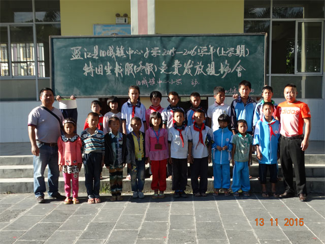 在赠送校服仪式上,中心小学校长冯德成希望孩子们努力学习,学会感恩,学会做人,以优异的成绩回报祖国,回报社会。