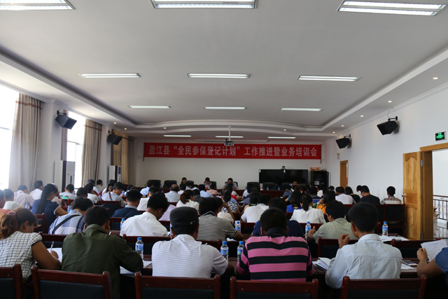 2016年5月24日下午,县政府在县人社局5楼会议室组织召开了盈江县全民参保登记计划工作推进暨业务培训会。县委常委、县人民政府副县长杨华,县财政、公安、发改、卫计、民政、统计等县直六部门的分管领导,各乡镇、农场主要领导、社会保障服务中心负责人、村级人社金融协办员,共计 153人参加了会议。州人社局的领导和相关业务中心负责人到会指导工作和培训业务。