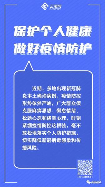 近期,多地出现新冠肺炎本土确诊病例,疫情防控形势依然严峻,广大群众须克服麻痹思想、懈怠情绪、松劲心态和侥幸心理,时刻紧绷疫情防控这根弦,毫不放松地落实个人防护措施,切实降低新冠病毒感染和传播风险。