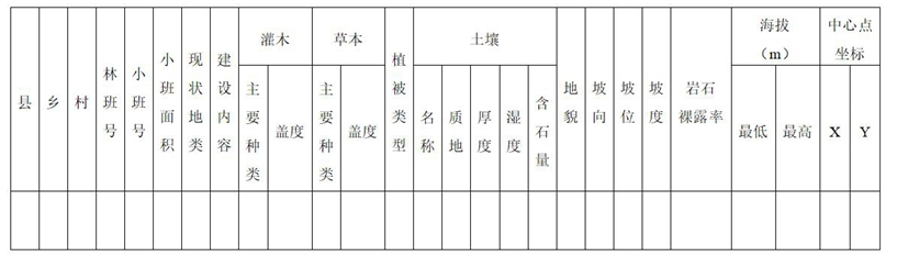 填表说明:1.立地因子的调查和划分标准执行《云南省森林资源规划设计调查操作细则》(云南省林业厅,2013年修订);2.灌木、草本的主要种类调查填写3种以上;3.“植被类型”根据现状调查的植被情况,依据《云南植被》中采用的分类原则、单位和系统,并参考《中国植被》、《云南森林》等植被专著确定。